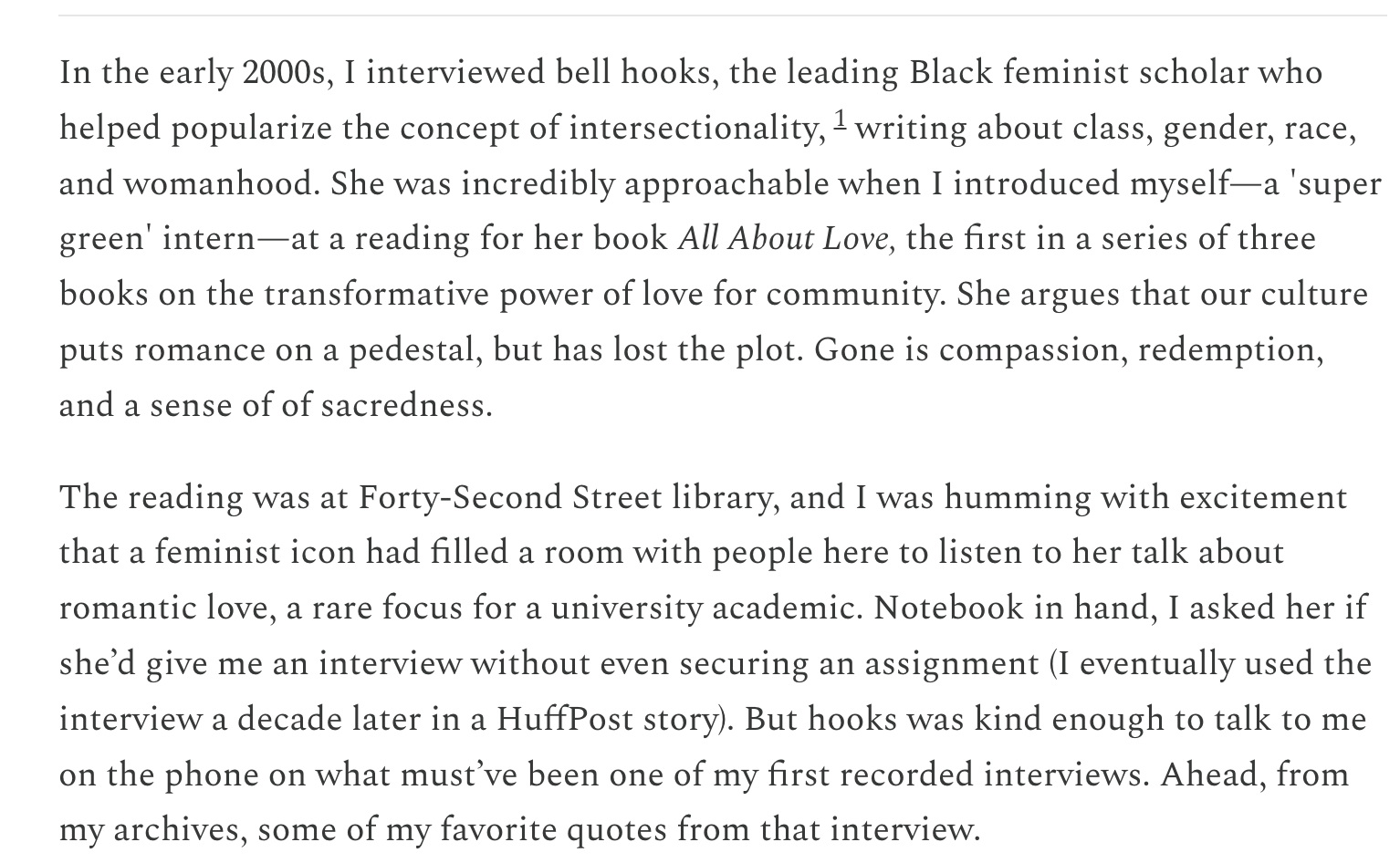 one of my first interviews was with feminist scholar, bell hooks